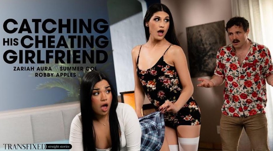 As “Catching His Cheating Girlfriend” opens, Zariah Aura and Summer Col have been having an affair for months. However, Summer has brought Zariah back to her home for the first time, believing her boyfriend, Robby Apples, is away. The two head into a walk-in closet, where Zariah fucks Summer from behind, up against the wall, before sitting down on a chair so Summer can ride Zariah in cowgirl. They move to the bed, where Summer rides Zariah some more, when suddenly, Robby walks in the door. Initially shocked and outraged, Robby calms down when he gets a good look at Zariah. All too happy to have Robby join them, Zariah and Summer invite Robby onto the bed, where Robby and Summer go down on Zariah. Then, it’s Zariah and Summer’s turn to go down on Robby. After that, the party is on, and the three go to town on each other in an orgy of licking, sucking, and fucking. Zariah and Robby DP summer, and then Robby fucks Zariah until he’s ready to finish, delivering a money shot all over Zariah’s and Summer’s pretty faces.