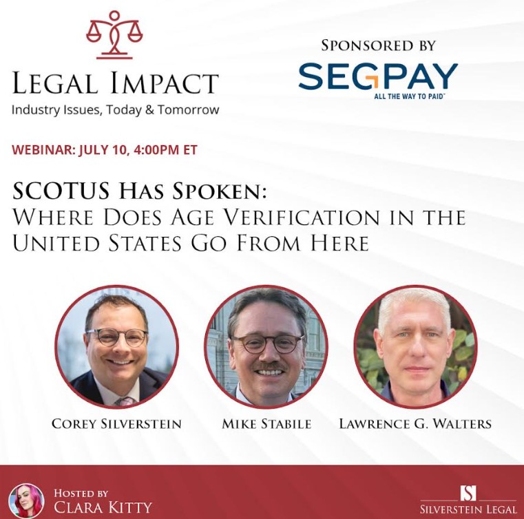 Chicago – Corey D. Silverstein, the driving force behind MyAdultAttorney.com and Adult.Law, is pleased to announce that his latest Legal Impact Webinar, titled “SCOTUS Has Spoken – Where Does Age Verification Go From Here” is now available for streaming.