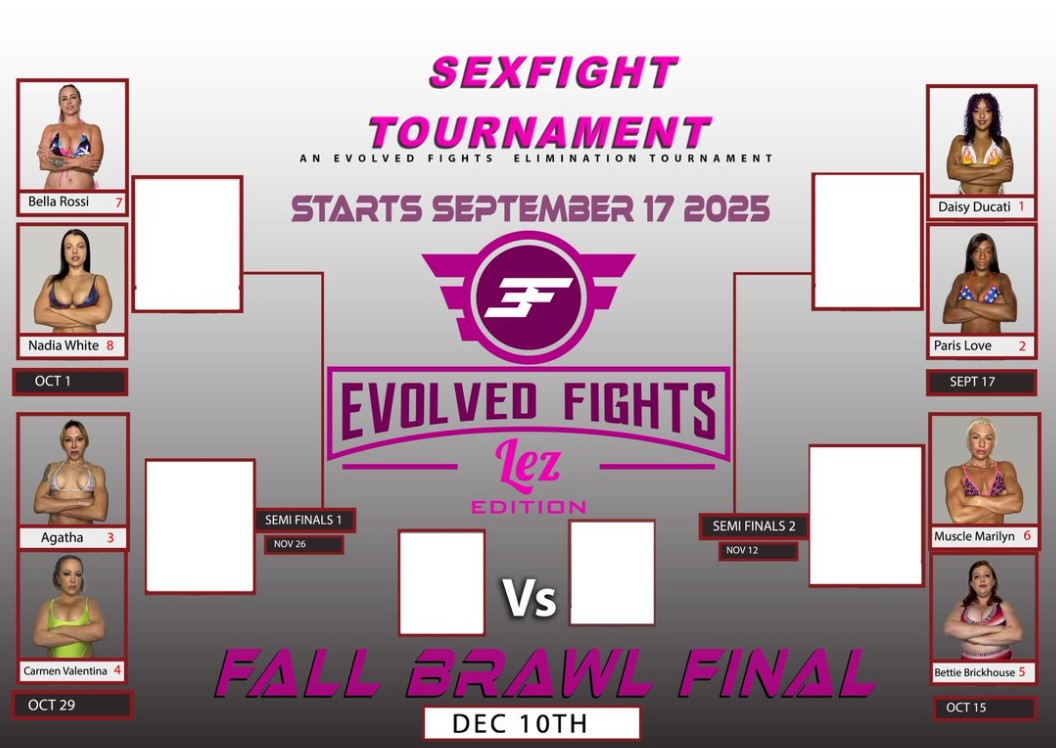 Every year, the Fall Brawl is one of the most exciting events on Evolved Fights Lez, with the top eight ranked sex fighters put in the single elimination tournament and all vying for the title of the Greatest Sex Fighter of All Time. Many adult stars have gone from performers to bona fide badasses after being in the tournament and even been inspired to give up bad habits like smoking and junk food to start serious training in martial arts. Some have gone on to become amateur fighters.