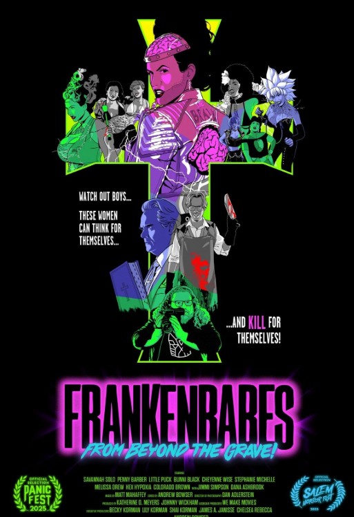 The film continues Bowser’s exploration of retro 80s aesthetics, with much of the creative team from Onyx the Fortuitous contributing to Frankenbabes, including cinematographer Dan Adlerstein, costume designer Lauren St. Laurent, FX makeup artist Eric Zapata, and the sound and music team of Mike Gallagher, Matt Mahaffey, and Leticia Wolf.