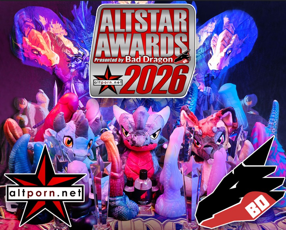 AltPorn.Net would like to welcome Bad Dragon as exclusive Presenting Sponsor of the 2026 AltStar Awards, aka the AltPorn Awards. Since 2008, Bad Dragon has made it their mission to help bring fantasy themes to life with their toys. The wonderfully depraved and creative artists over at Bad Dragon are famous for their unique and varied custom colored fantastical silicone toys. Bad Dragon is remarkable for always having a wide range of designs with a lot of in-stock toys, for when you just can’t wait, and also for a wide range of customization for size, color, firmness, and pour style, when you absolutely have to have it your way. The fantasy toymaker’s variety extends from dildos to strokers to packers to sheathes you can wear down there to accessorize that fursuit to their newer award-winning ovipositors. Their desirable merch ranges from blacklights to view their UV pour toys to spooky character enamel pins to T-shirts which subtly communicate your interests to bumper stickers which read, “My other ride is a Bad Dragon.” Recent designs include a pair of punk hyena toys and a retooling of the ever-popular Chance the Horse.