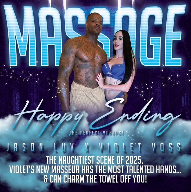 “Happy Ending – The Perfect Massage,” starring Violet Voss and Jason Luv, drops today and is definitely a good time for the stars and the viewers. The scene opens with Violet ordering an at-home massage after a long week. When her hot and chiseled masseur, Jason, shows up, she’s pleasantly surprised and turned on. To prepare for her massage, Violet dresses in lingerie and high heels, surprising and arousing Jason. Once on the table, Jason starts by massaging the inside of Violet’s thighs and quickly makes his way to eating her magical pussy. Then Jason strips down so Violet can give his massive cock a sloppy BJ, and the two fuck in various positions on the massage table. It ends with Jason giving Violet a creampie.