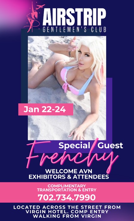 Chicago—Beautiful, blonde reality star and feature dancer Frenchy Morgan is heading to Las Vegas to perform at the Airstrip Gentlemen’s Club during the AEE/AVN Expo on Thursday, January 22 through Saturday, January 24, across the street from the Virgin Hotel & Casino and entry fees will be comped to all expo attendees.