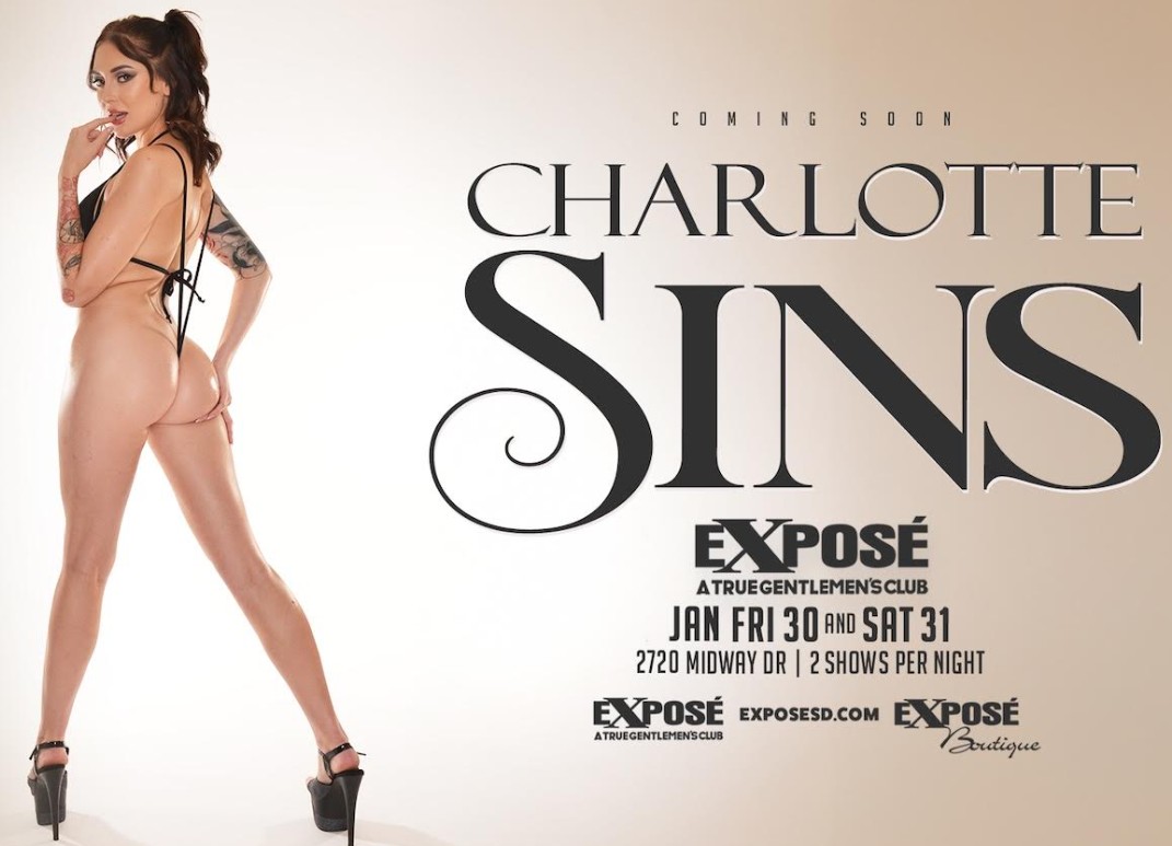Get ready for Charlotte Sins’ two-night feature at Exposé Gentlemen’s Club in San Diego, CA, this Friday and Saturday. Fans and club patrons can watch Charlotte hit the main stage twice nightly for two electrifying shows, along with multiple chances to meet your favorite statuesque superstar, snap selfies, and buy her branded merch. And for the adventurous, purchase a VIP lap dance or two for the full Charlotte experience.