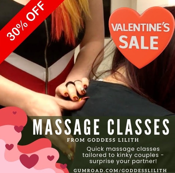 Chicago—Award-winning Goddess Lilith is offering a Valentine’s Day Special on Her massage classes for both submissives wishing to delight their Masters and Massage for Couples 101. The multi-hyphen adult superstar is celebrating the romantic holiday with a sweet deal, 30% off with the code VALENTINES! The special will run until end of Valentine’s Weekend.