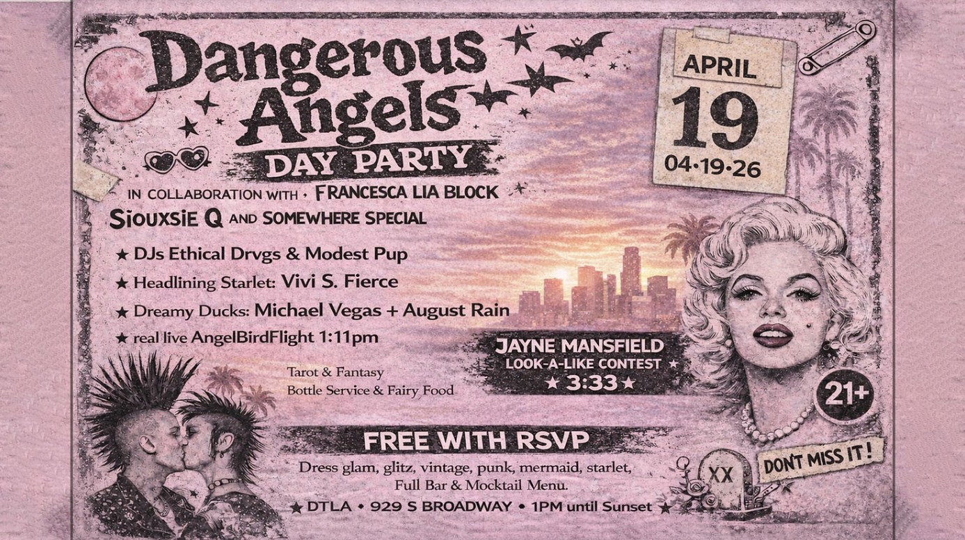 Los Angeles – Award-winning director, producer, performer, and creative force Siouxsie Q (https://www.instagram.com/siouxsieqmedia) invites guests to step into a world of fantasy and nostalgia at the “Dangerous Angels” Day Party, taking place Sunday, April 19 from 1 PM to 7 PM at Somewhere Special, the rooftop bar at the top of the STILE Hotel in Downtown Los Angeles. The event is free with RSVP, which can be made at https://partiful.com/e/KYHG66forgK2TrK5eAUU.